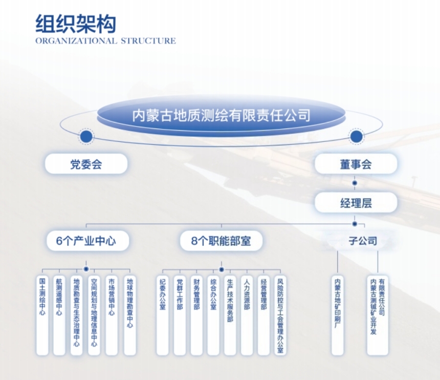 公司下设8个机关部室及市场营销、国土测绘、航测遥感、空间规划与地理信息、地质勘查与生态治理、地球物理勘查6大产业中心,拥有1家全资子公司——地矿印刷厂,1家控股公司——内蒙古测铖矿业开发有限责任公司。